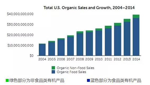 從上世紀(jì)90年代以來(lái),美國(guó)消費(fèi)者對(duì)于有機(jī)產(chǎn)品的需求以每年兩位數(shù)的比例在增長(zhǎng)。有機(jī)產(chǎn)品的銷(xiāo)售額從1997年的36億美元增加到2014年的390億美元。2014年有機(jī)產(chǎn)品銷(xiāo)售額比2013年增長(zhǎng)11%左右(2013年為359億美元),有機(jī)食品銷(xiāo)售占整個(gè)食品市場(chǎng)份額約4%-5%左右。