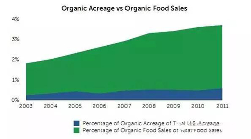 綠色為有機(jī)食品銷(xiāo)售占全部食品銷(xiāo)售的比例