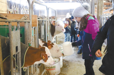 尼利耶農場定期向周邊學校開放,邀請學生們前來參觀。圖為一名學生正在給奶牛喂水。